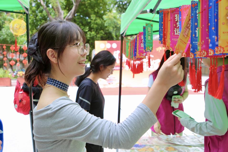 长长的彩绳下,垂挂着百张灯谜,璎珞随风轻摇,相映成趣。谜面包罗万象,同学们三五成群,仰头细读;时而陷入沉思,眉宇微蹙;时而灵光一现,迫不及待验证答案。在猜与想的交融中,古老的文字与年轻的思维欣然相遇,焕发出盎然生机。