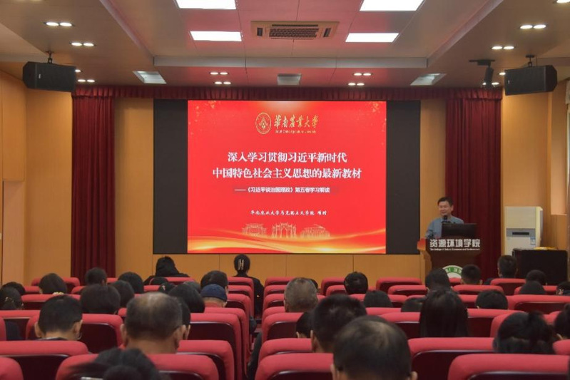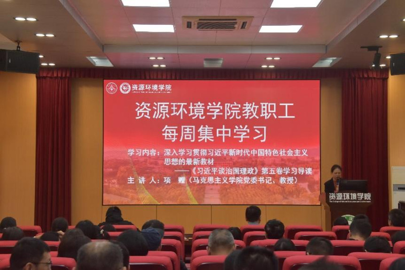 为深入学习贯彻习近平新时代中国特色社会主义思想,持续推动党的创新理论走深走实,2025年10月23日下午,资源环境学院在院楼105报告厅举办《习近平谈治国理政》第五卷专题学习辅导报告会,邀请了马克思主义学院党委书记项赠教授主讲。全院教职工参会,会议由学院党委书记易晖主持。