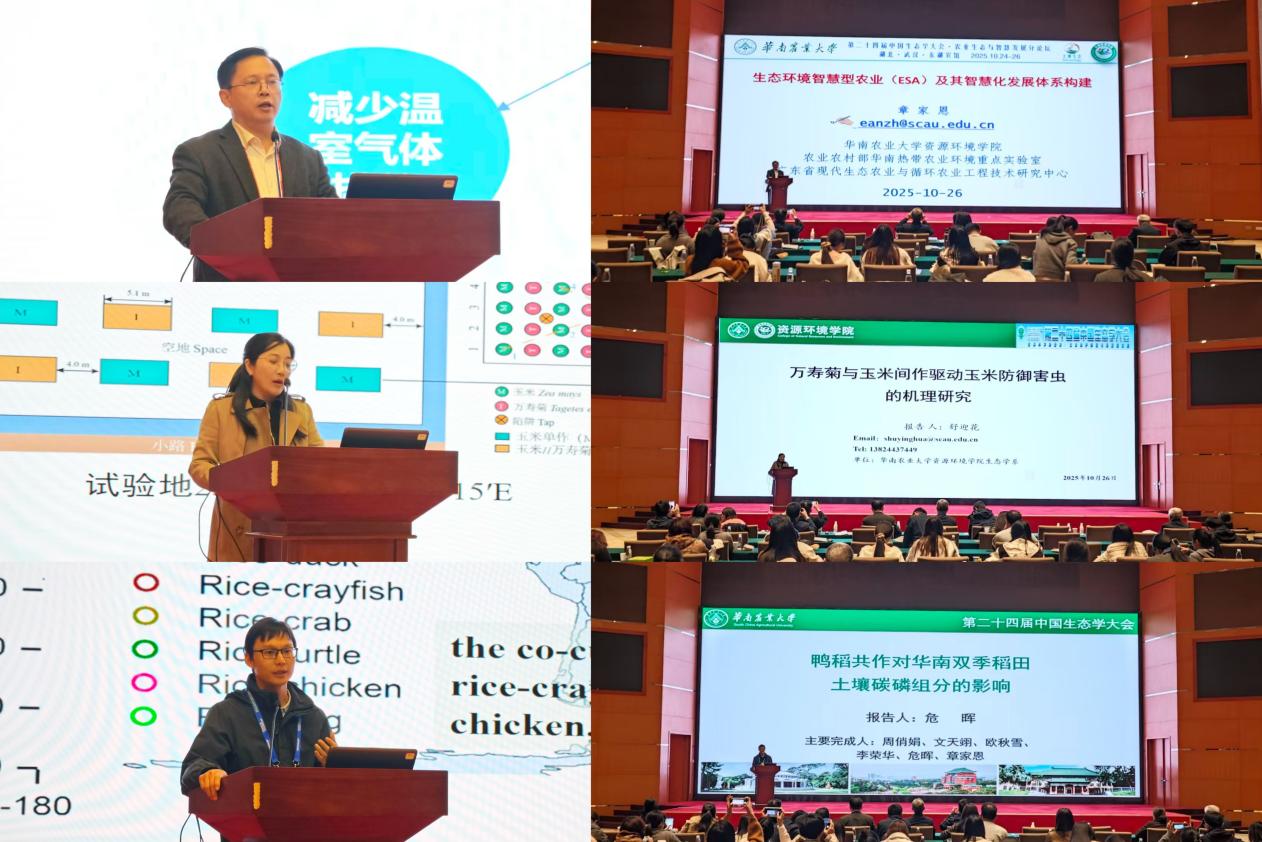 在该分会场,舒迎花教授作了题为“万寿菊与玉米间作驱动玉米防御害虫的机理研究”的学术报告,危晖副教授作了题为“鸭稻共作对华南双季稻田土壤碳磷组分的影响”的学术报告。此外,硕士研究生周惠婷在全国生态学研究生论坛“水体、景观保护与污染物防治”分会场作了题为“农田土壤微生物养分限制对多西环素与酸雨复合胁迫的响应”的口头报告。我校师生在本次大会多个平台分享了农业生态领域的最新进展,充分展现了我校科研团队在农业生态与生态农业理论创新与实践应用方面的成果积累与前沿探索。