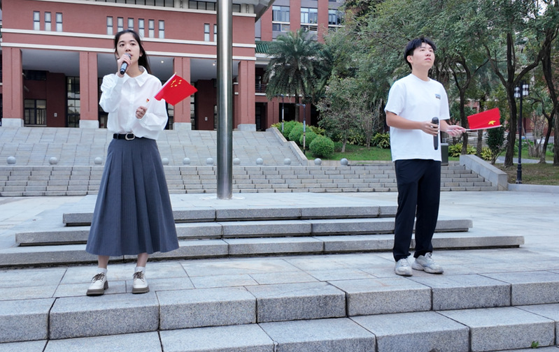 学生代表朗诵爱国诗歌《红色家书》,用真挚的语言传递出革命先辈的家国情怀与坚定信仰。“我爱你中国 ,亲爱的母亲,我为你流泪,我为你自豪”,全体同学挥舞手中的小红旗,齐声合唱《我爱你中国》,激昂的歌声汇聚成对祖国最深沉的告白,将现场气氛推向高潮。