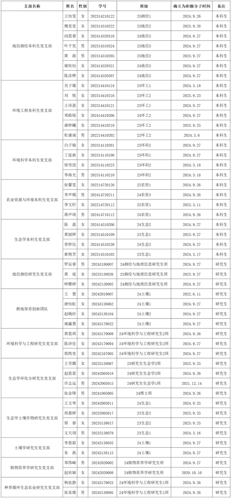 经资源环境学院地信测绘本科生党支部、农业资源与环境本科生党支部、生态学本科生党支部、环境科学本科生党支部、环境工程本科生党支部、地信测绘研究生党支部、生态学土壤作物研究生党支部、植物营养学研究生党支部、土壤学研究生党支部、耕地保育团队党支部、生态学环化分研究生党支部、环境科学与工程研究生党支部、种养循环与生态农业党支部等13个党支部研究决定,拟于近期讨论确定王怡雯(等)49位同志为发展对象,现将有关情况公示如下,公示时间为9月29日至10月3日共5天。