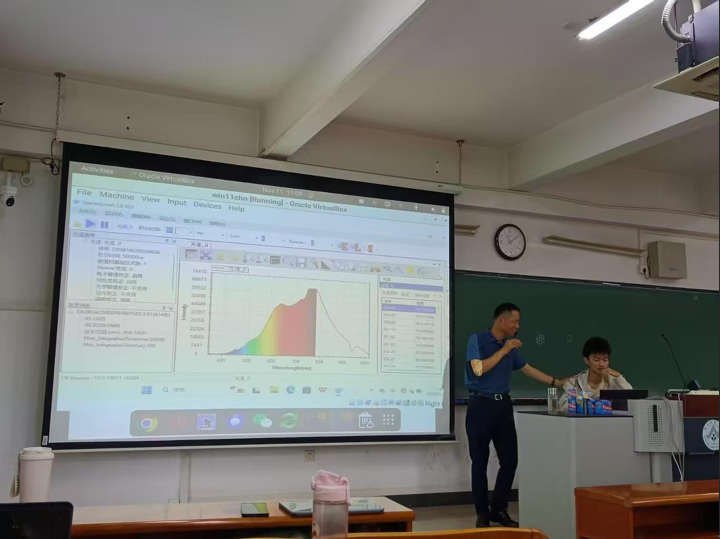 在专题讲座中,屈永华教授首先围绕科研级光谱仪的原理与应用展开理论讲解,随后带领同学们进入实践操作环节。他现场展示了自主研发的遥感教学工具箱,指导同学们依次完成光谱测量、叶片反射光谱采集等实验操作。
