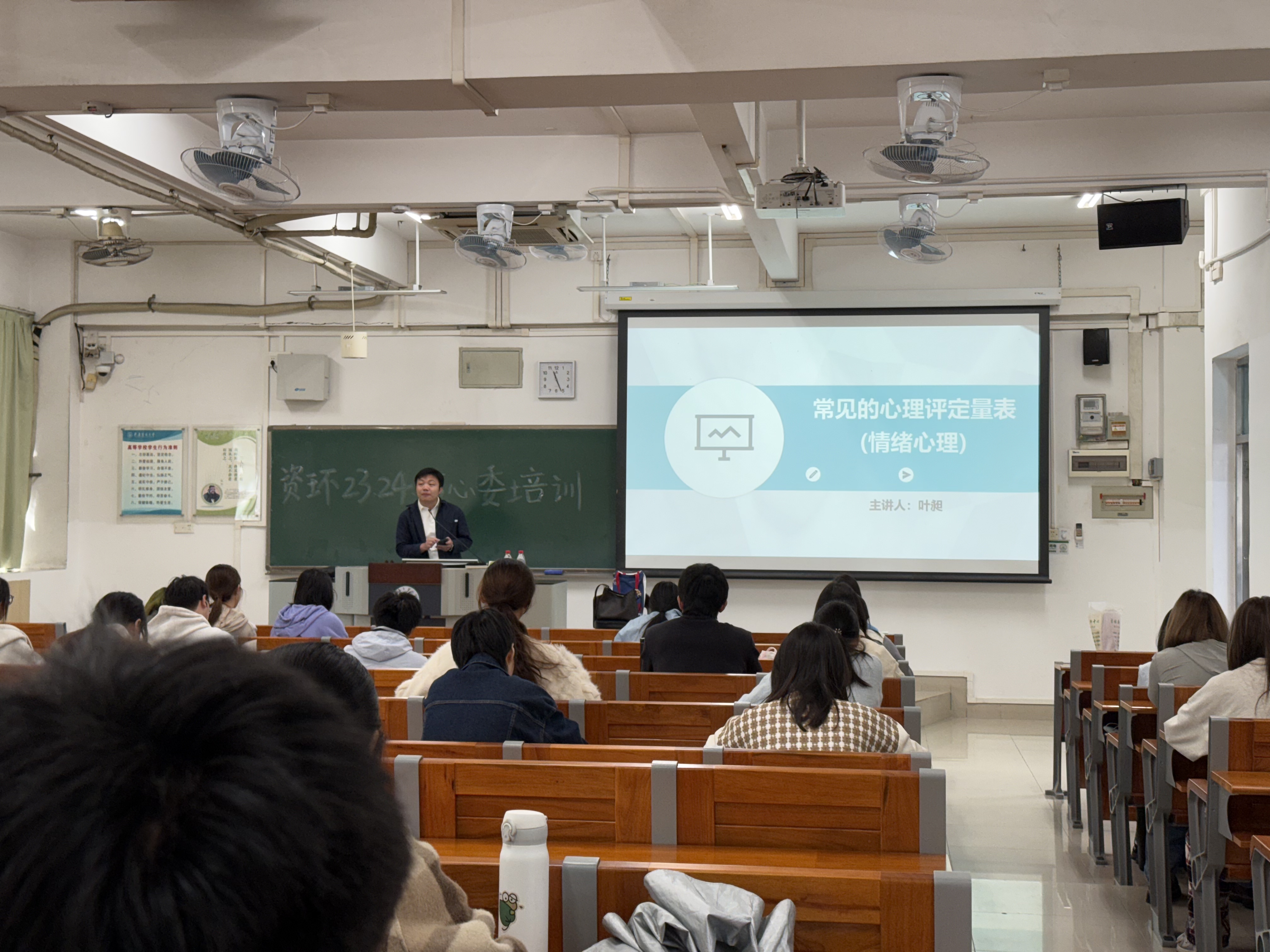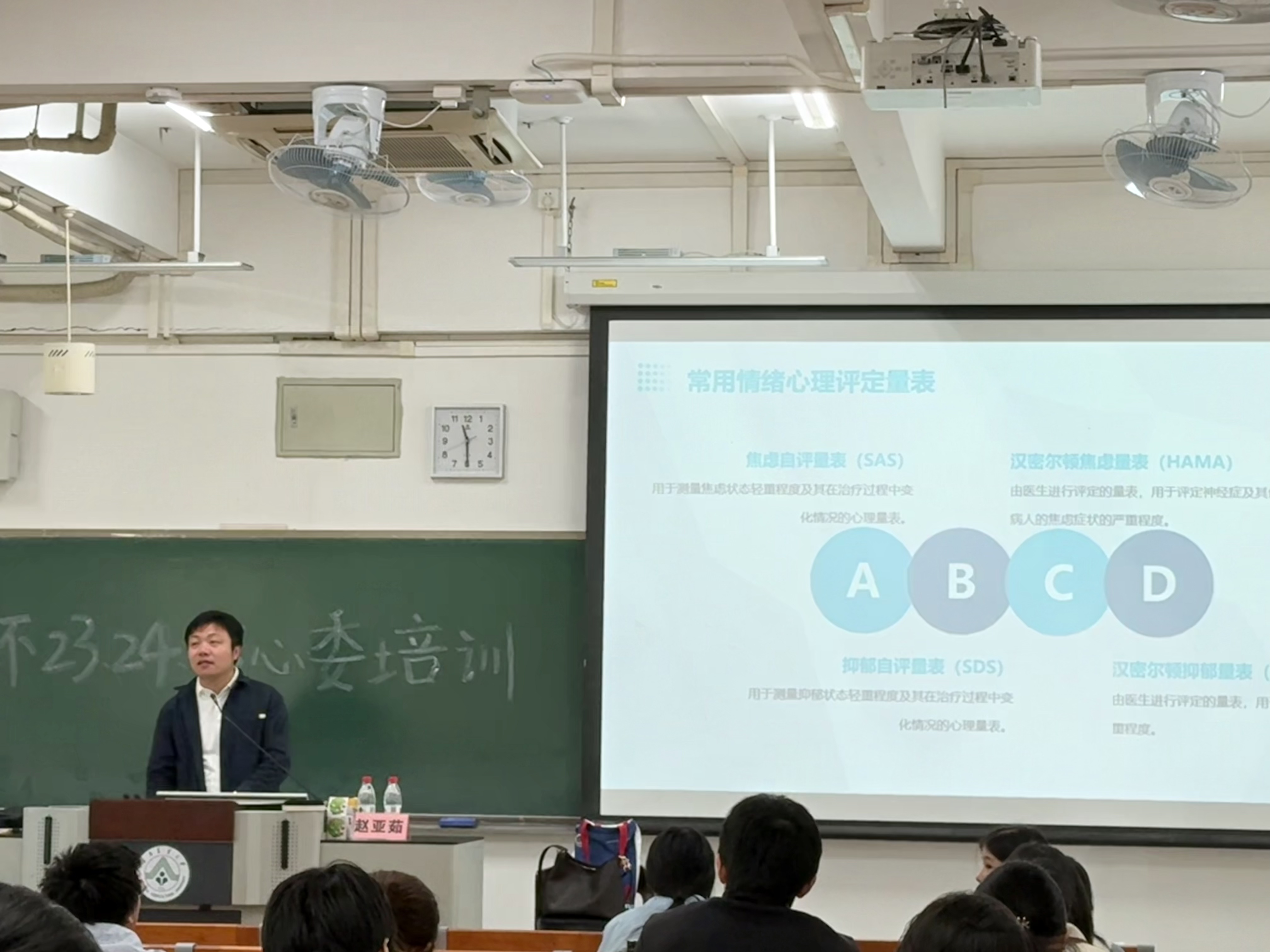 随后,叶老师聚焦于焦虑和抑郁两种常见情绪量表,系统阐述了量表的施测流程。他从量表的选择、评定前的准备工作,到施测的具体步骤和注意事项,逐一进行了细致讲解与现场示范。叶老师结合生动案例和实践经验,帮助心理委员们对量表的使用建立了更加直观和深入的理解。