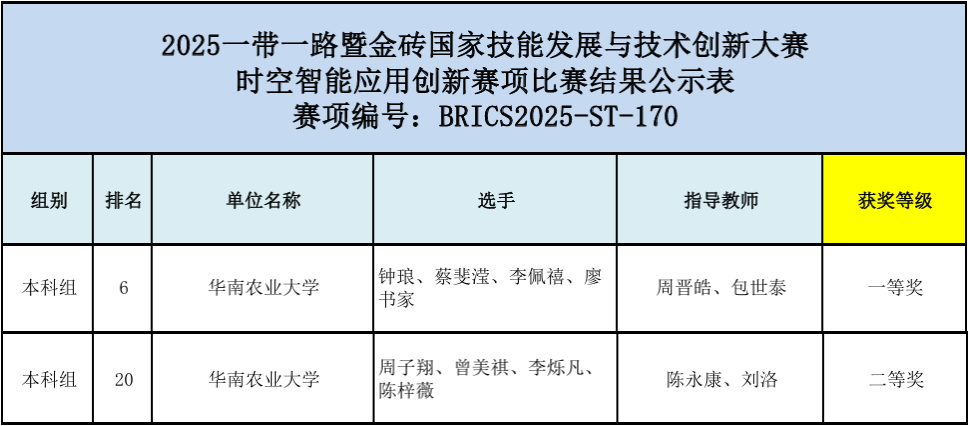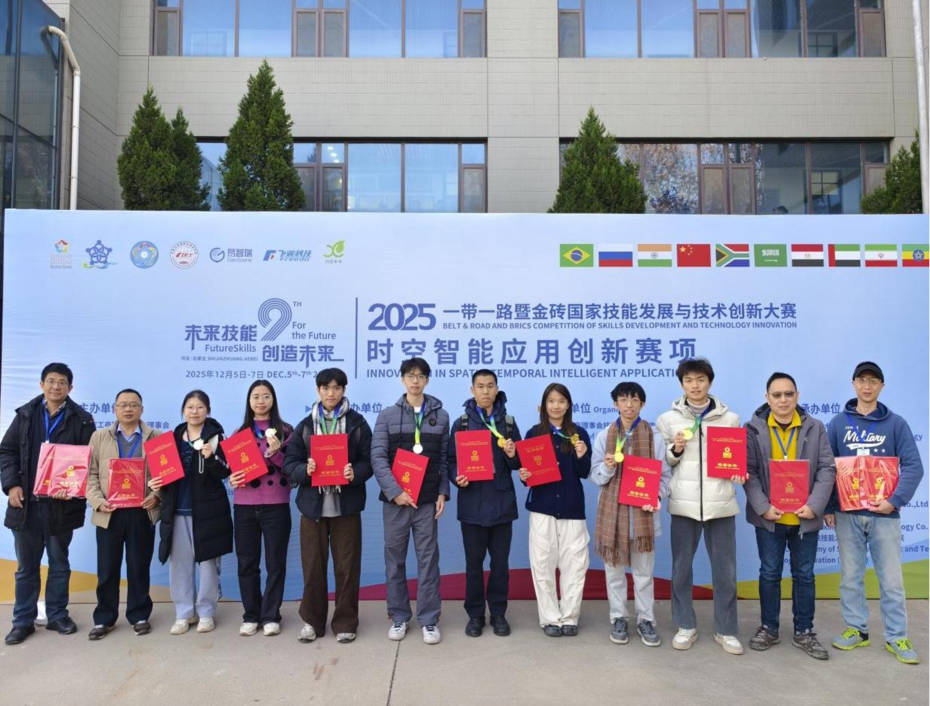 12月5日-7日,2025一带一路暨金砖国家技能发展与技术创新大赛之时空智能应用创新赛项在石家庄隆重举行,我院地理信息科学专业23级本科生钟琅、周子翔、陈梓薇、曾美祺和24级本科生李佩禧、李烁凡、蔡斐滢、廖书家在测绘与地理信息系陈永康、包世泰、刘洛、周晋皓老师的带领下赴现场参赛,经过激烈角逐,我校两支参赛队分别荣获一等奖和二等奖,我校获颁最佳组织奖。