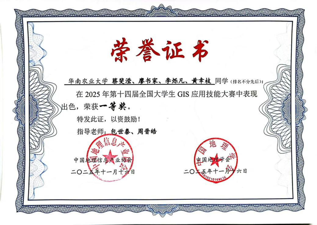 又讯11月15日,由中国地理信息产业协会、中国地理学会主办的2025年第十四届全国大学生GIS应用技能大赛在西安举办。在测绘与地理信息系包世泰、周晋皓老师的指导下,我院地理信息科学专业本科生蔡斐滢、廖书家、李烁凡、黄幸枝表现出色,荣获一等奖。该项赛事作为国内水平最高、规模最大的GIS学科竞赛之一,旨在不断提升地理信息相关专业学生的素质,促进我国地理信息高等教育水平的提升。
