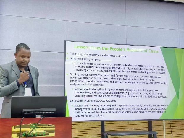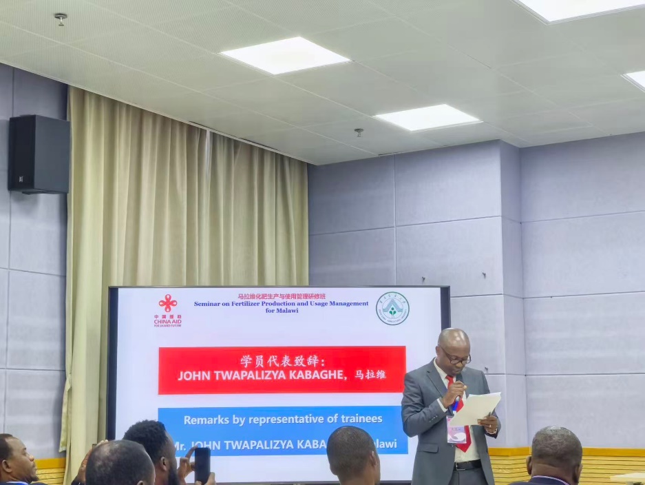 研修班学员代表、马拉维外交部官员John Twapalizya Kabaghe在发言中,感谢中国政府及华南农业大学的精心组织与热情接待,认为本次研修内容兼具实用性与系统性,培训形式丰富多样,不仅使学员系统掌握先进的化肥生产与施用管理技术,也深切感受到中国人民的友好情谊。他表示,马拉维愿以本次研修班为契机,进一步深化与中方在农业技术、人才培养、科研合作等领域的交流,携手推动农业可持续发展。