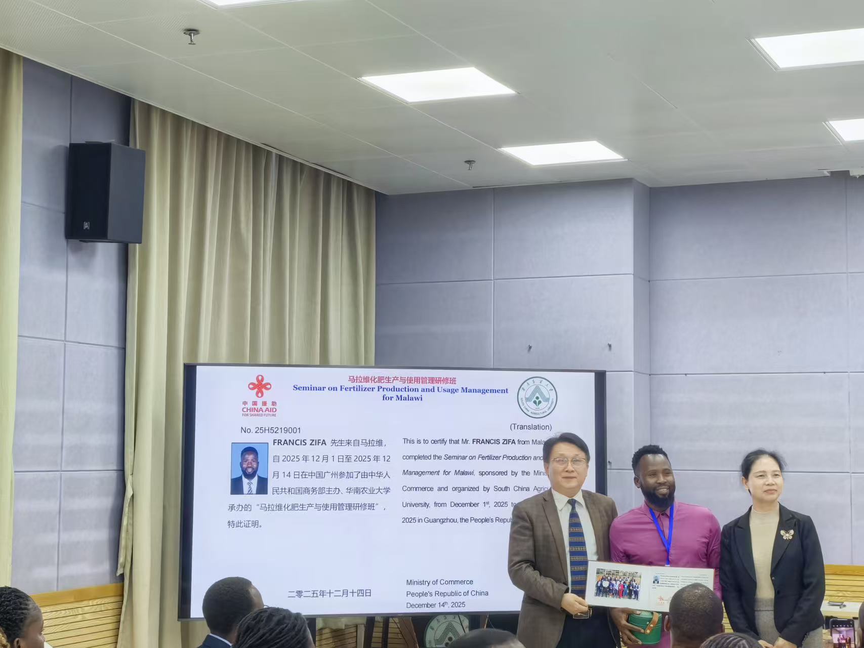 2025年12月1日至14日,由中华人民共和国商务部主办、华南农业大学资源环境学院联合国际教育学院承办的援外培训项目——“马拉维化肥生产与使用管理研修班”在我校成功举办并顺利结业。来自马拉维从事肥料、土壤、农业管理的24名官员完成了为期14天的系统培训。