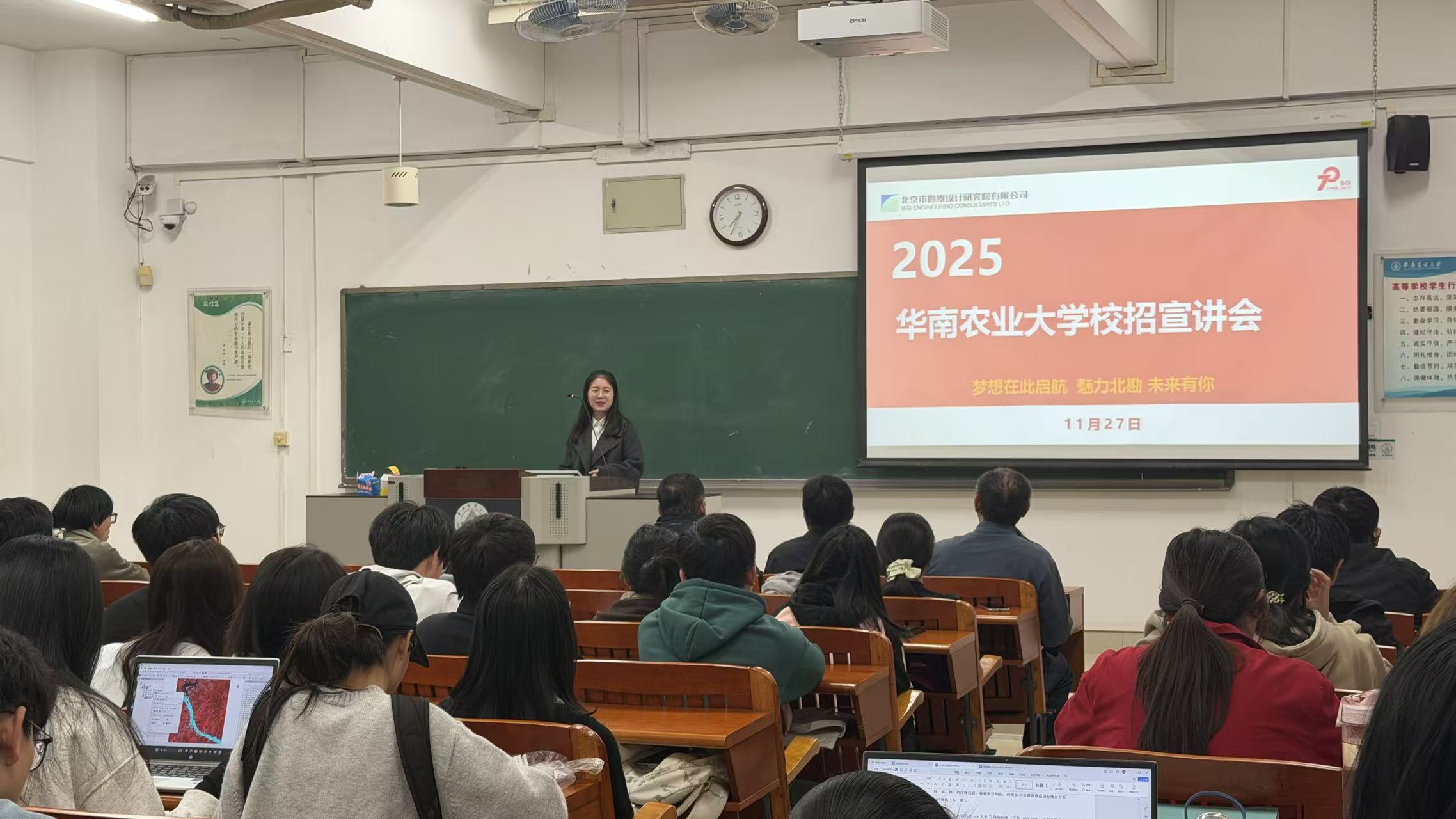 11月27日,北京市勘察设计研究院有限公司校园招聘团队抵达华南农业大学资源环境学院举办校园宣讲招聘会。活动现场,北勘团队围绕北勘介绍、职业发展及薪资福利进行了干货满满的分享,同学们积极提问、热烈互动,现场氛围高涨。