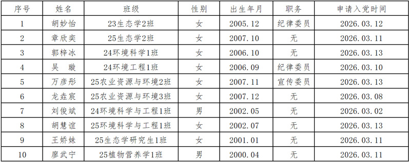 资源环境学院环境工程本科生党支部、环境科学本科生党支部、生态学本科生党支部、农业资源与环境本科生党支部、环境科学与工程研究生党支部、生态学环化分研究生党支部、植物营养学研究生党支部等7个党支部于2026年3月12日至2026年3月13日共接收入党申请书10份。