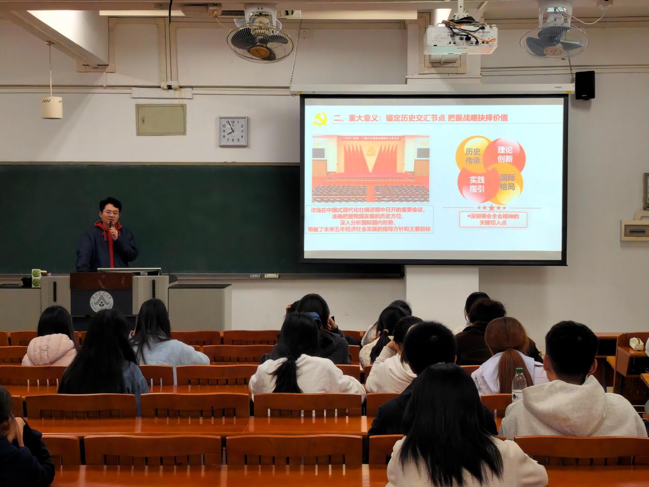 唐吕彬老师带领全体团支书系统回顾了“十四五”时期我国在经济社会发展、科技创新、生态文明建设等12个领域取得的历史性成就与突破性进展。他着重指出,我国在绿色低碳转型、生态环境质量持续改善等方面的显著成效,与资源环境专业学子的学业方向、职业使命高度契合,勉励大家坚定专业自信,自觉将个人成长融入国家绿色发展大局,以专业所长服务生态文明建设事业。