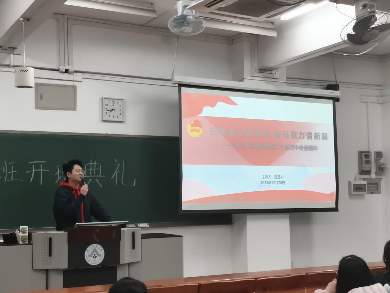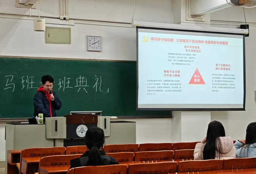 为深入学习领会党的二十届四中全会精神,精准把握“十五五”时期国家发展的宏伟蓝图和战略部署,切实推进“党支部引领团支部”结对工程落地见效,12月28日晚,我院第5期“青马班”学员在教五D栋205举行“接续奋斗担使命,青马聚力谱新篇”专题团课。本次团课由学院环境工程本科生党支部书记唐吕彬主讲,挂钩团支部青马班学员参加学习,以党建引领团学工作,推动理论学习走深走实。