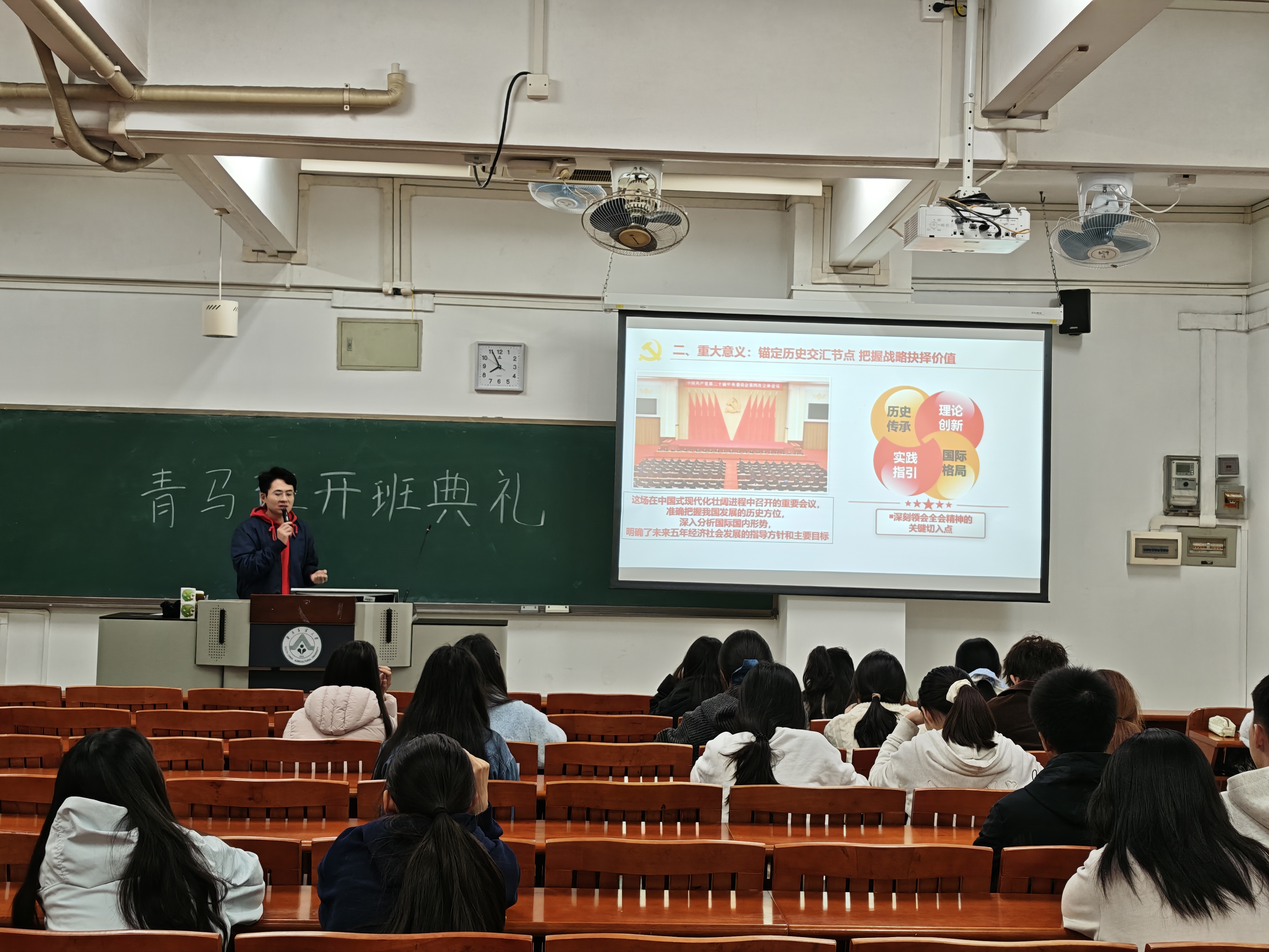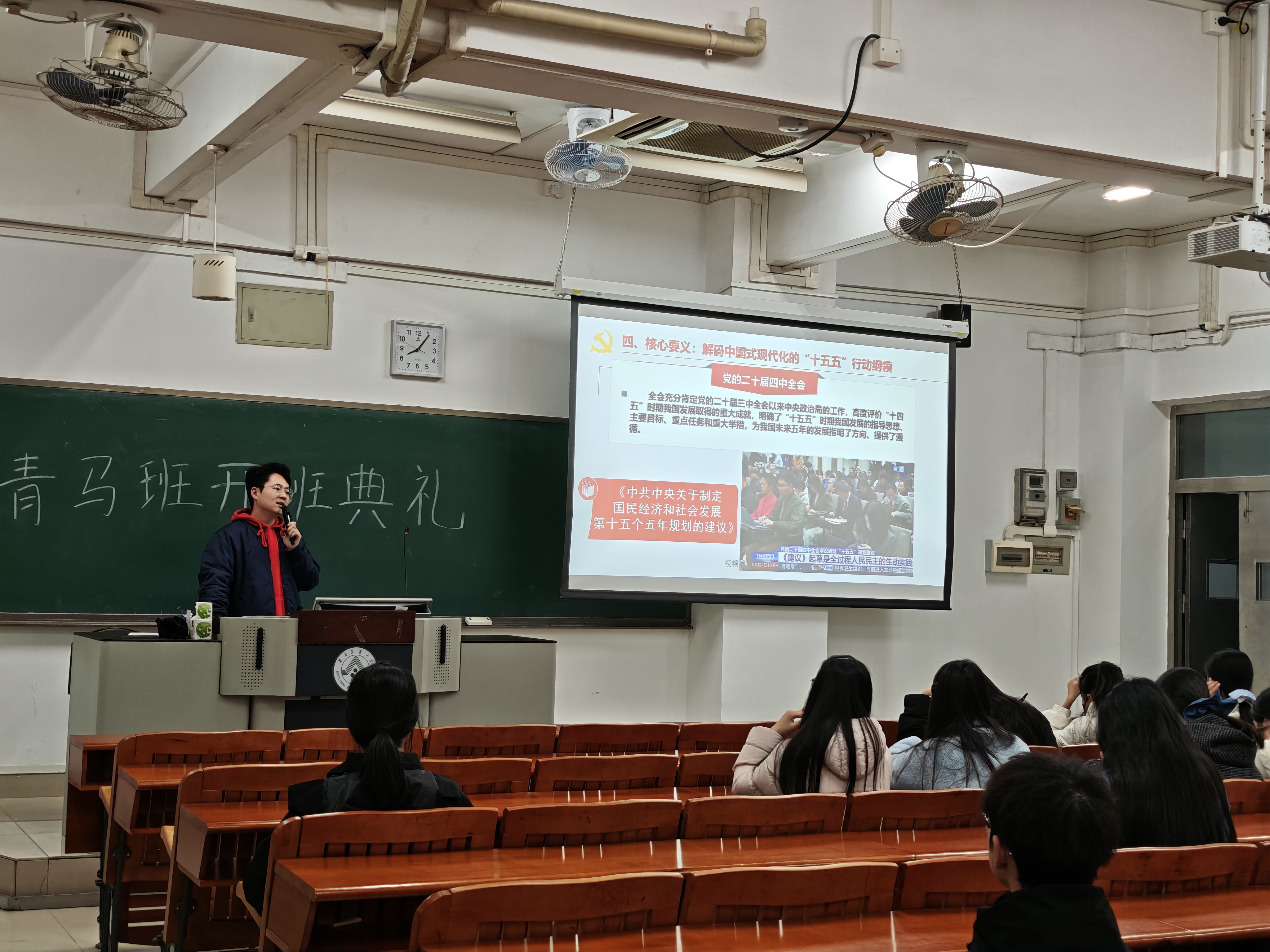在讲解“十五五”行动纲领时,唐老师详细解读了《中共中央关于制定国民经济和社会发展第十五个五年规划的建议》的框架与核心内容,重点阐述了生态文明建设与绿色发展的战略部署。他强调,作为青年马克思主义者,要准确把握国家发展的历史方位,增强“四个意识”、坚定“四个自信”、做到“两个维护”,在机遇与挑战并存的时代背景下保持战略定力。