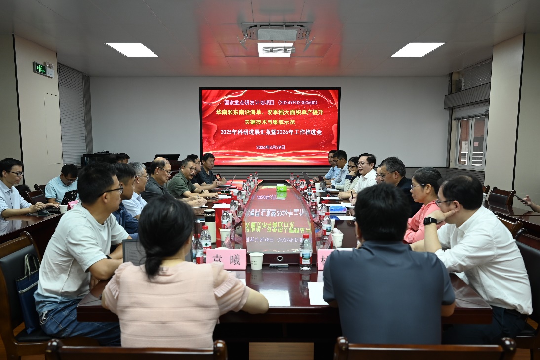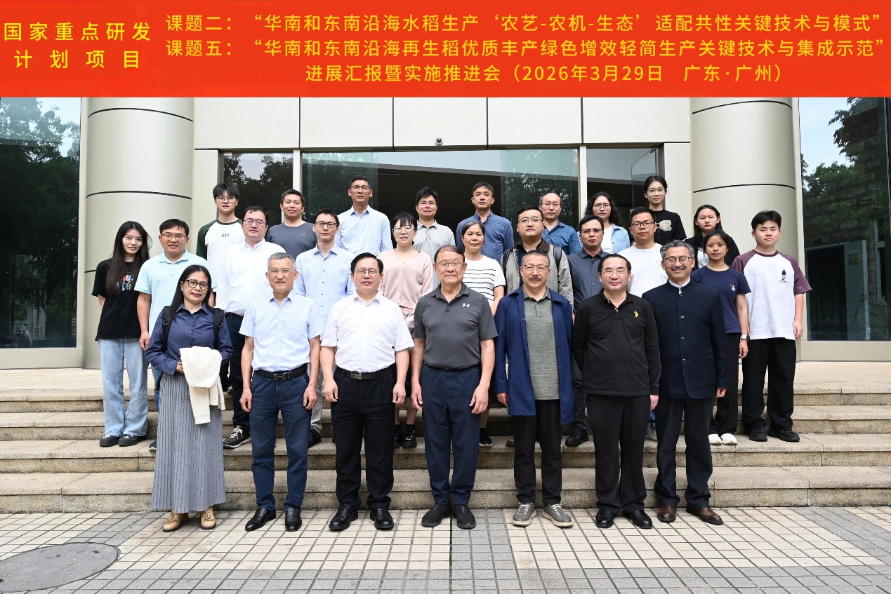 2026年3月29日,“十四五”国家重点研发计划“华南和东南沿海单、双季稻大面积单产提升关键技术与集成示范”项目在广州组织召开课题进展汇报暨工作推进会。华南农业大学骆世明教授、华中农业大学曹凑贵教授、广东省农业科学院水稻研究所钟旭华研究员应邀出席会议。项目首席兼课题二负责人华南农业大学章家恩教授、课题五负责人福建省农业科学院水稻研究所姜照伟研究员,以及各子课题负责人和主要骨干成员参加会议。会议由章家恩教授主持。