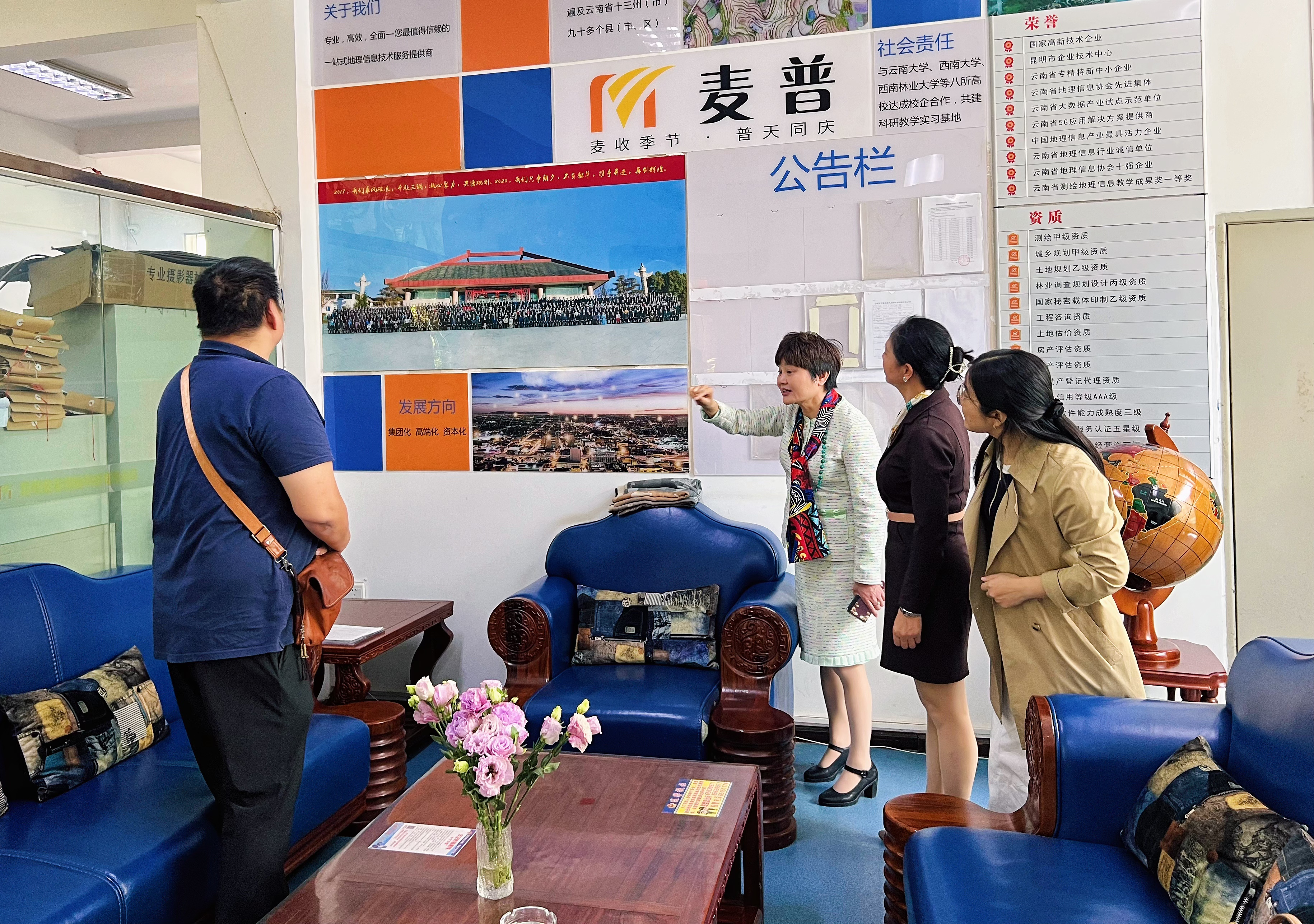 为深入贯彻落实“稳就业”“保就业”决策部署,扎实推进“优企引才”定向访企拓岗促就业专项行动,深化产教融合与校企合作,进一步推动学科建设与产业需求精准对接,4月9日,资源环境学院党委书记易晖、院长刘承帅一行5人前往昆明麦普空间科技有限公司进行访企拓岗专项调研与产学研合作交流。昆明麦普空间科技有限公司董事长、1988届土化专业校友冯瑶全程陪同并主持交流活动。