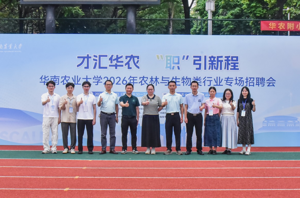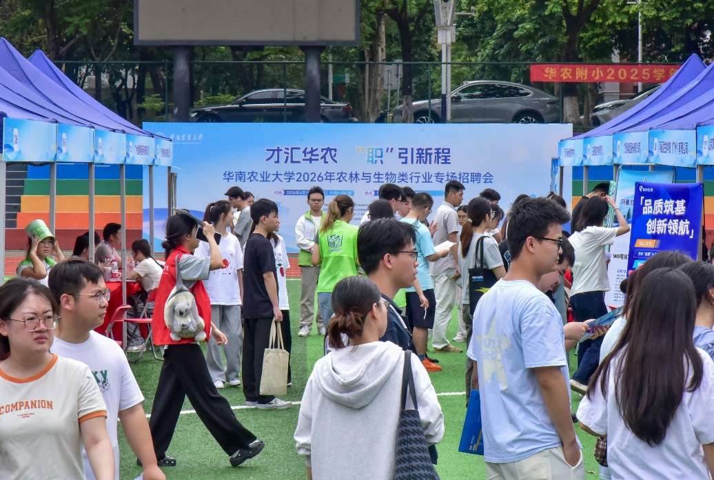 4月10日,由华南农业大学党委学生工作部(党委研究生工作部)主办,农学院、植物保护学院、林学与风景园林学院、园艺学院、资源环境学院、生命科学学院、国际教育学院(广州都柏林国际生命科学与技术学院)等7个农林与生物类学院共同承办,韶关学院学生工作部(招生与就业指导中心)协办的“才汇华农‘职’引新程”2026年农林与生物类行业招聘会在学校六一区运动场成功举行。
