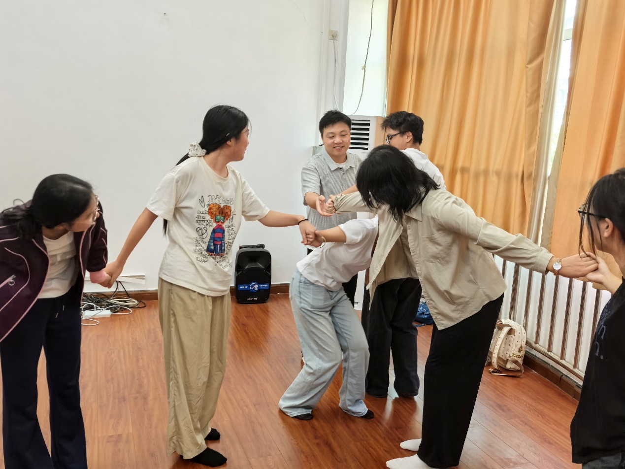 随后,“心有千千结”团队任务将活动推向高潮。心理委员们分成两组,在手拉手形成的“人体结”中,通过持续沟通、尝试与协作,或钻或跨,共同寻找解结的路径。这一过程模拟了现实中可能遇到的复杂人际状况与管理困境,使心理委员们深刻体会到:只要保持连接、积极沟通、彼此信任,再复杂的困境也能找到解决之道。有成员分享道:“起初的混乱是最大的困难,但在大家协作、主动倾听建议后,我们最终成功解开了结。”